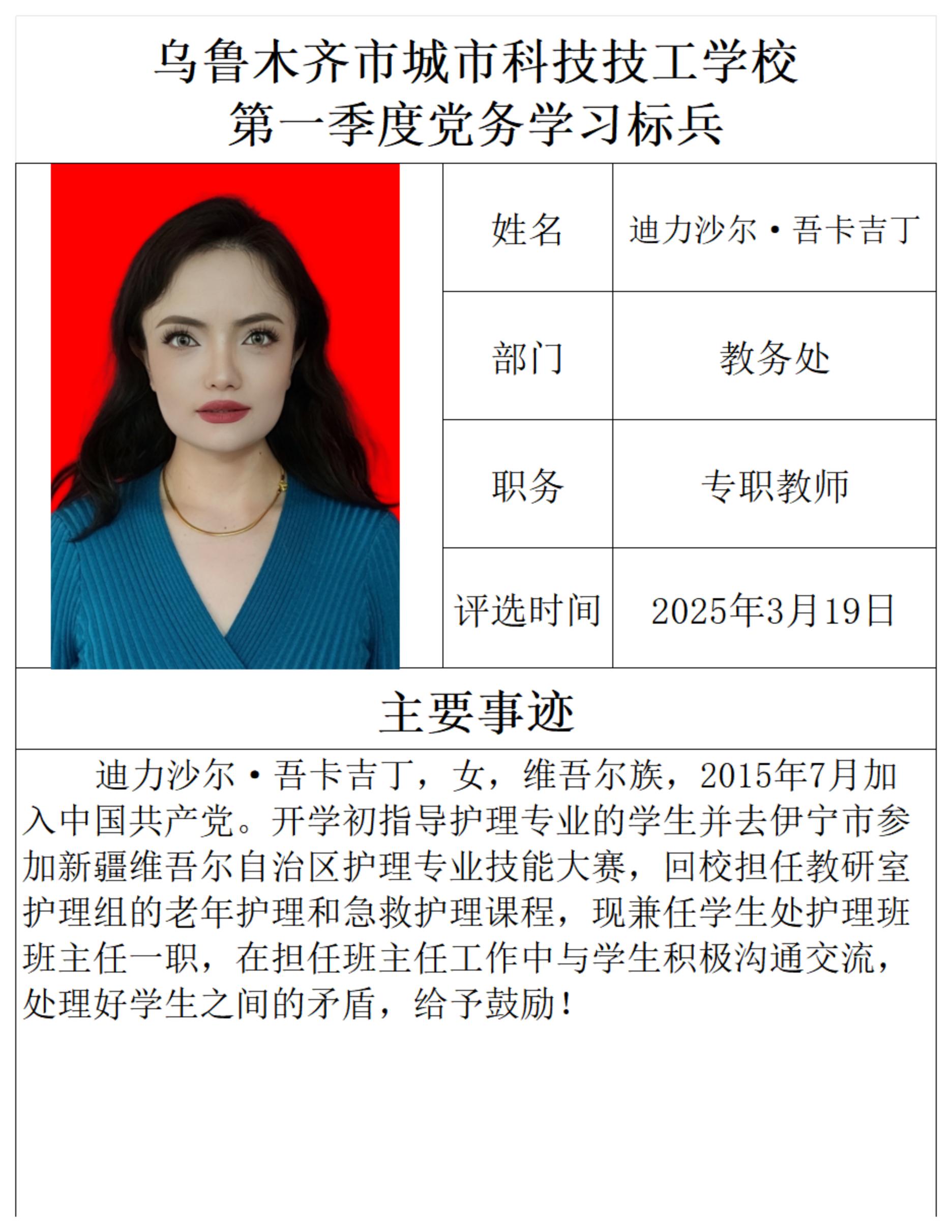 乌鲁木齐市城市科技技工学校 第一季度党务学习标兵
